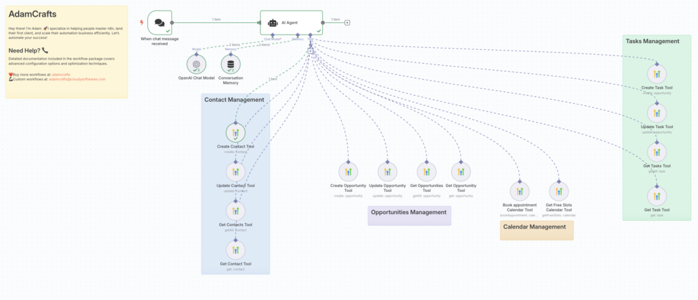 When you send a message like, "Create a new contact for John Doe at john@email.com" the automation instantly captures the information and creates the contact. Ask it to "Find all open deals for ABC Corp" and it will search your pipeline. Need to schedule a follow-up? Just say "Create a task to call John Doe next Tuesday." 📅 This assistant handles everything from contact creation and opportunity management to task setting and appointment booking, turning tedious CRM admin into a fast and simple conversation.